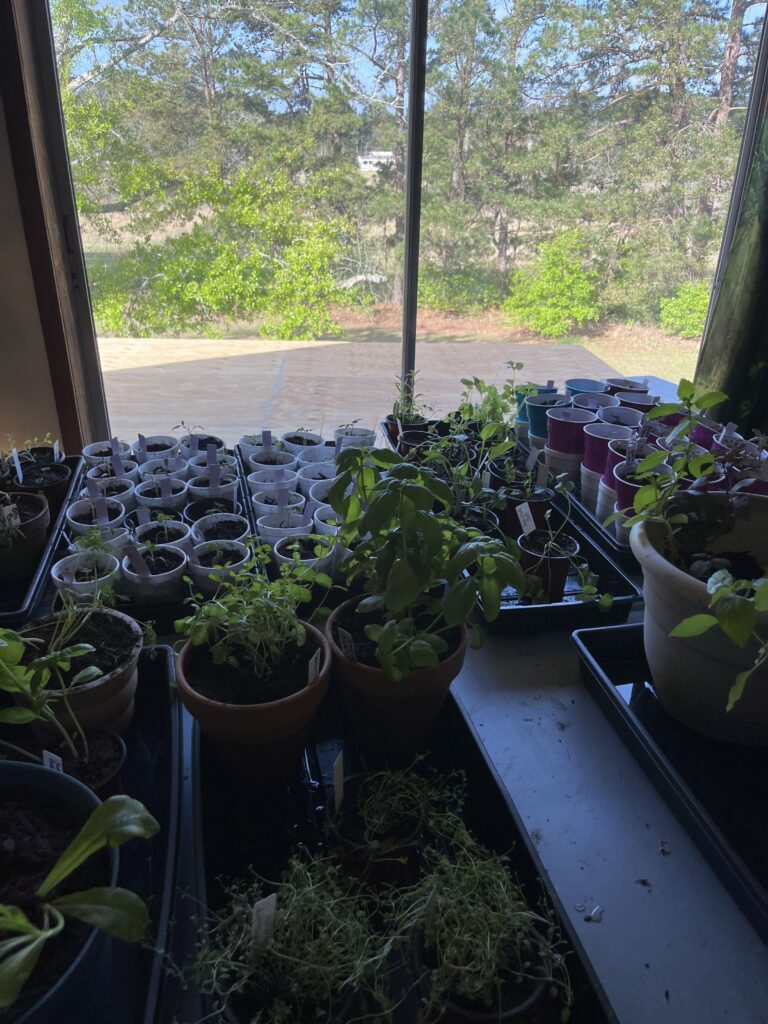 I mostly finished in the seedling room on Saturday. All that’s left to do is wash up all of my pots and trays, get everything put away or stored…and start Chamomile, Cushaw and Luffa. There are so, so many full pots out there ready to go live on the Herb Deck until winter shows up…at which time, the seedling room, which is about to be transformed into a den, after it’s done being a barn, will become a hothouse for those perennials.