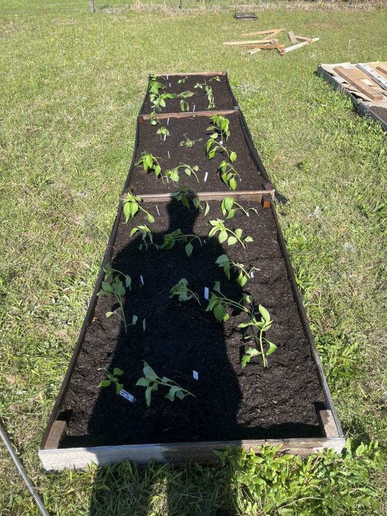Luckily, that evening, Jeremy and I got out in the big garden and got all of our pepper plants transplanted! Oh, I can’t wait until the first little pepper shows up! I get my hands dirty most days upstairs dealing with my seedlings and herb plants…but there is NOTHING like putting your hands into the sun-warmed soil to plant that first transplant or seedling outside. It just felt great!